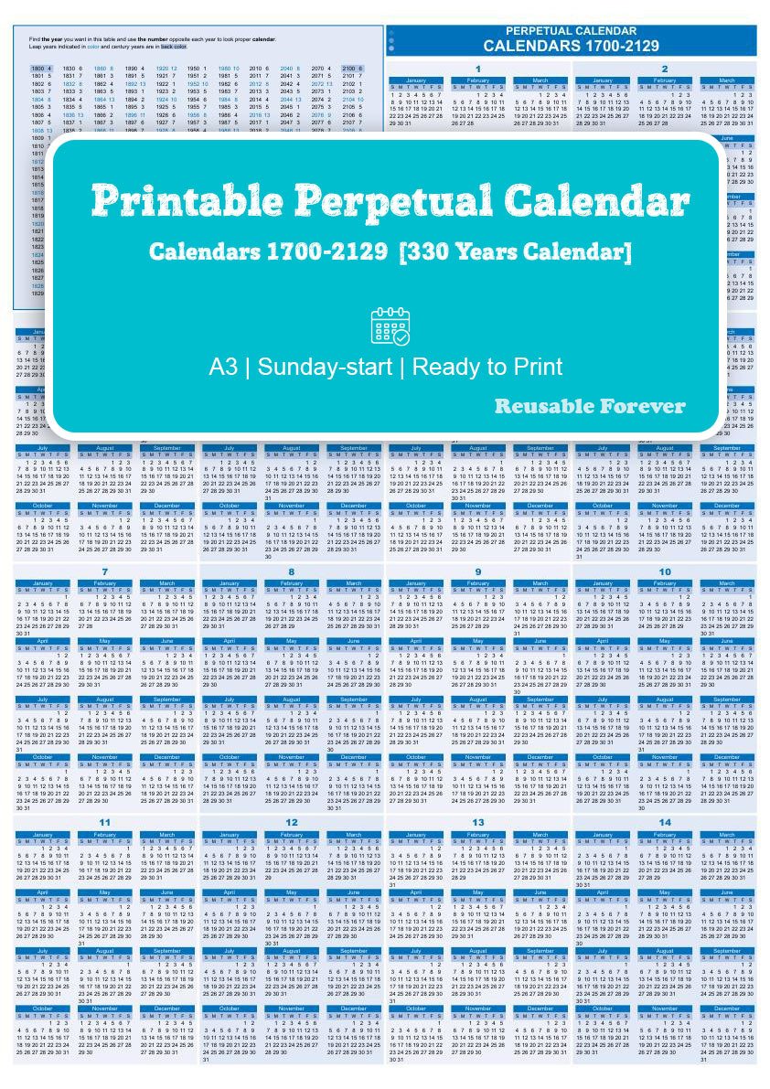 Printable Perpetual Calendar | A3 | Sunday-start | Style 1 | Blue
